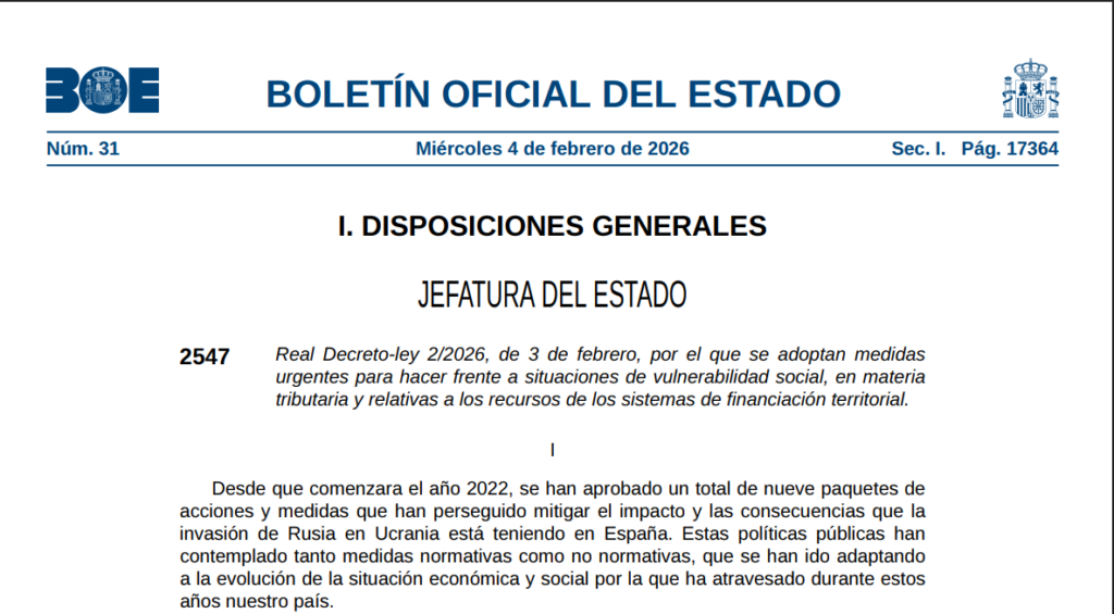 El Real Decreto-ley 2/2026, de 3 de febrero introduce un nuevo paquete de medidas urgentes de carácter social, tributario, laboral, energético y de financiación territorial, en un contexto marcado por la persistencia de situaciones de vulnerabilidad económica, tensiones geopolíticas y la necesidad de sostener la cohesión social. BOE-A-2026-2547