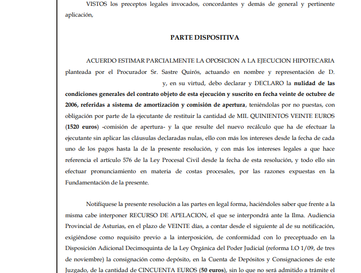 En febrero de 2026, el Juzgado de Primera Instancia nº 11 de Oviedo dictó Auto estimando parcialmente la oposición formulada por la parte ejecutada en un procedimiento de ejecución hipotecaria promovido por una entidad financiera.