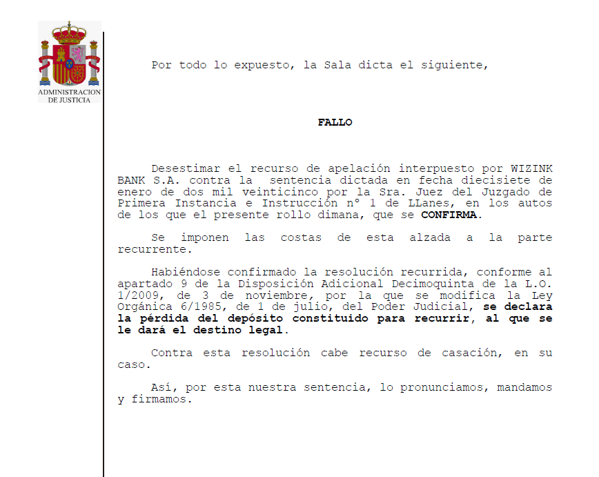 En su resolución, el tribunal desestima el recurso de apelación interpuesto por la entidad bancaria y ratifica la sentencia dictada en primera instancia, que ya había declarado la nulidad del contrato. Aunque la Audiencia considera que el tipo de interés aplicado no puede calificarse como usurario, concluye que el contrato no supera el control de transparencia exigido por la normativa de protección de consumidores.